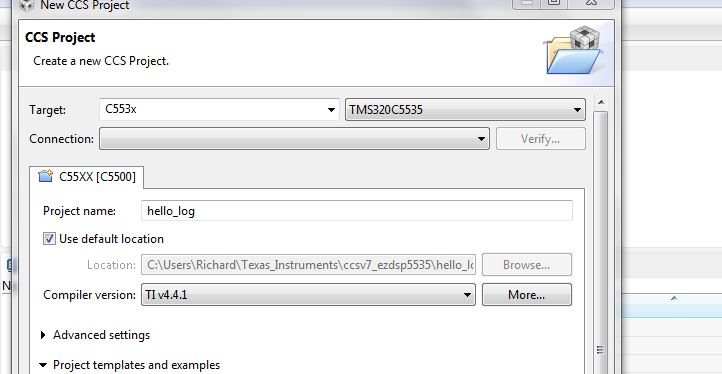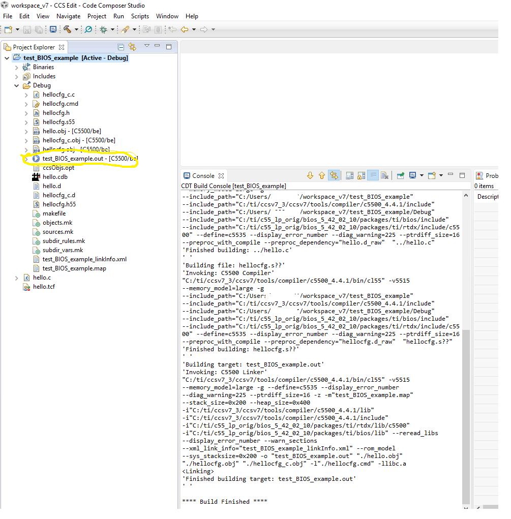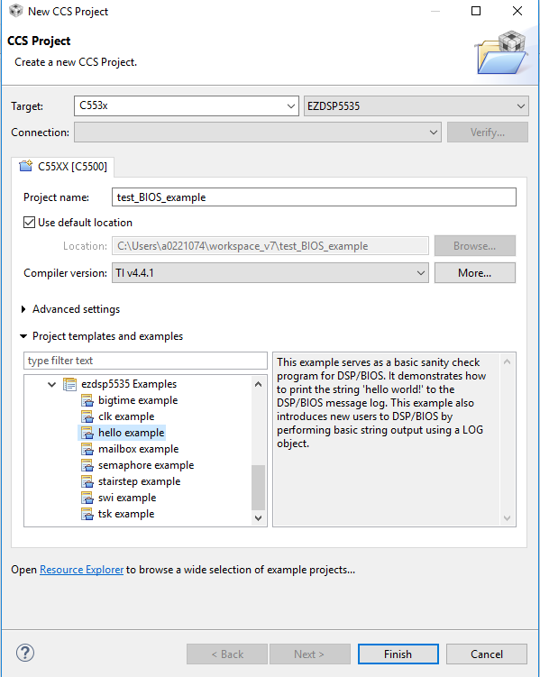 So I make a copy of DSP/BIOS v5.xx / ezdsp5535 Examples / hello example...