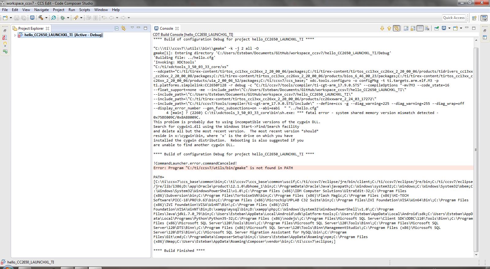"C:\\ti\\ccsv7\\utils\\bin\\gmake" -j -k all -O gmake[1]: Entering directory 'C:/Users/Esteban/Documents/GitHub/workspace_ccsv7/mt8442_cc2650launchxl/Debug''Building file: ../TOOLS/app_ble_uartlog.cfg''Invoking: XDCtools'"C:/ti/tirex-content/xdctools_3_32_00_06_core/xs" --xdcpath="C:/ti/tirtos_cc13xx_cc26xx_2_18_00_03/packages;C:/ti/tirtos_cc13xx_cc26xx_2_18_00_03/products/tidrivers_cc13xx_cc26xx_2_16_01_13/packages;C:/ti/tirtos_cc13xx_cc26xx_2_18_00_03/products/bios_6_45_02_31/packages;C:/ti/tirtos_cc13xx_cc26xx_2_18_00_03/products/uia_2_00_05_50/packages;C:/ti/ccsv7/ccs_base;" xdc.tools.configuro -o configPkg -t ti.targets.arm.elf.M3 -p ti.platforms.simplelink:CC2650F128 -r release -c "C:/ti/ccsv7/tools/compiler/ti-cgt-arm_5.2.6" --compileOptions "-mv7M3 --code_state=16 --abi=eabi -me -O4 --opt_for_speed=0 --include_path=\"C:/Users/Esteban/Documents/GitHub/workspace_ccsv7/mt8442_cc2650launchxl/Profiles\" --include_path=\"C:/Users/Esteban/Documents/GitHub/workspace_ccsv7/mt8442_cc2650launchxl/Application\" --include_path=\"C:/Users/Esteban/Documents/GitHub/workspace_ccsv7/mt8442_cc2650launchxl/ICallBLE\" --include_path=\"C:/Users/Esteban/Documents/GitHub/workspace_ccsv7/mt8442_cc2650launchxl/Startup\" --include_path=\"C:/Users/Esteban/Documents/GitHub/workspace_ccsv7/mt8442_cc2650launchxl/Board\" --include_path=\"C:/ti/simplelink_academy_01_09_00_0000/modules/projects/support_files/Components/uart_log\" --include_path=\"C:/ti/simplelink/ble_sdk_2_02_00_31/src/examples/simple_peripheral/cc26xx/app\" --include_path=\"C:/ti/simplelink/ble_sdk_2_02_00_31/src/inc\" --include_path=\"C:/ti/simplelink/ble_sdk_2_02_00_31/src/icall/inc\" --include_path=\"C:/ti/simplelink/ble_sdk_2_02_00_31/src/profiles/roles/cc26xx\" --include_path=\"C:/ti/simplelink/ble_sdk_2_02_00_31/src/profiles/roles\" --include_path=\"C:/ti/simplelink/ble_sdk_2_02_00_31/src/profiles/dev_info\" --include_path=\"C:/ti/simplelink/ble_sdk_2_02_00_31/src/profiles/simple_profile/cc26xx\" --include_path=\"C:/ti/simplelink/ble_sdk_2_02_00_31/src/profiles/simple_profile\" --include_path=\"C:/ti/simplelink/ble_sdk_2_02_00_31/src/common/cc26xx\" --include_path=\"C:/ti/simplelink/ble_sdk_2_02_00_31/src/components/heapmgr\" --include_path=\"C:/ti/simplelink/ble_sdk_2_02_00_31/src/controller/cc26xx/inc\" --include_path=\"C:/ti/simplelink/ble_sdk_2_02_00_31/src/components/hal/src/target/_common\" --include_path=\"C:/ti/simplelink/ble_sdk_2_02_00_31/src/components/hal/src/target\" --include_path=\"C:/ti/simplelink/ble_sdk_2_02_00_31/src/components/hal/src/target/_common/cc26xx\" --include_path=\"C:/ti/simplelink/ble_sdk_2_02_00_31/src/components/hal/src/inc\" --include_path=\"C:/ti/simplelink/ble_sdk_2_02_00_31/src/components/osal/src/inc\" --include_path=\"C:/ti/simplelink/ble_sdk_2_02_00_31/src/components/services/src/sdata\" --include_path=\"C:/ti/simplelink/ble_sdk_2_02_00_31/src/components/services/src/saddr\" --include_path=\"C:/ti/simplelink/ble_sdk_2_02_00_31/src/components/icall/src/inc\" --include_path=\"C:/ti/tirtos_cc13xx_cc26xx_2_18_00_03/products/cc26xxware_2_23_03_17162\" --include_path=\"C:/ti/ccsv7/tools/compiler/ti-cgt-arm_5.2.6/include\" -g --c99 --gcc --define=USE_ICALL --define=POWER_SAVING --define=SBP_TASK_STACK_SIZE=700 --define=GAPROLE_TASK_STACK_SIZE=520 --define=HEAPMGR_SIZE=0 --define=Display_DISABLE_ALL --define=BOARD_DISPLAY_EXCLUDE_UART --define=xBOARD_DISPLAY_EXCLUDE_LCD --define=ICALL_MAX_NUM_TASKS=3 --define=ICALL_MAX_NUM_ENTITIES=6 --define=xdc_runtime_Assert_DISABLE_ALL --define=Xxdc_runtime_Log_DISABLE_ALL --define=MAX_NUM_BLE_CONNS=1 --define=CC26XX --define=xdc_FILE=\"\"\"\" --define=UARTLOG_NUM_EVT_BUF=32 --diag_warning=225 --diag_warning=255 --diag_wrap=off --display_error_number --gen_func_subsections=on " "../TOOLS/app_ble_uartlog.cfg" 4 [main] ? (1356) C:\ti\tirex-content\xdctools_3_32_00_06_core\bin\sh.exe: *** fatal error - system shared memory version mismatch detected - 0x75BE009C/0x8A88009C.This problem is probably due to using incompatible versions of the cygwin DLL.Search for cygwin1.dll using the Windows Start->Find/Search facilityand delete all but the most recent version. The most recent version *should*reside in x:\cygwin\bin, where 'x' is the drive on which you haveinstalled the cygwin distribution. Rebooting is also suggested if youare unable to find another cygwin DLL.