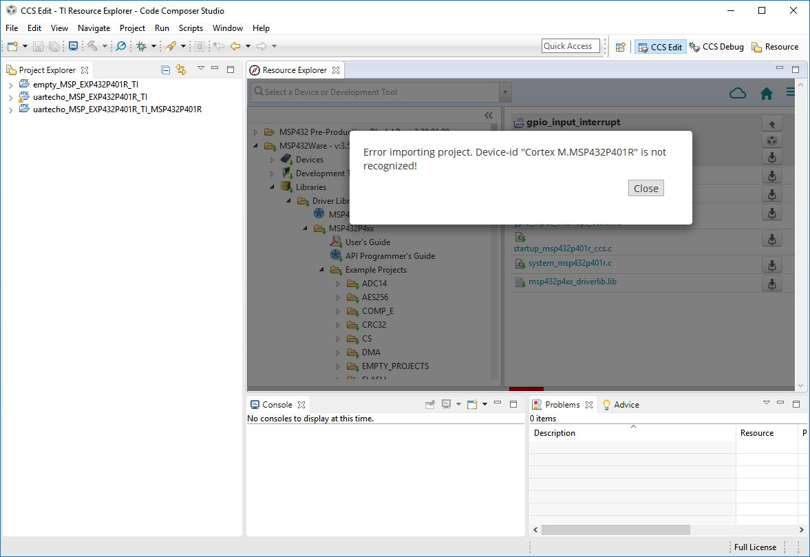 When Importing example using Resource Explorer "Error importing project. Device-id "Cortex M.MSP432P401R" is not recognized!"