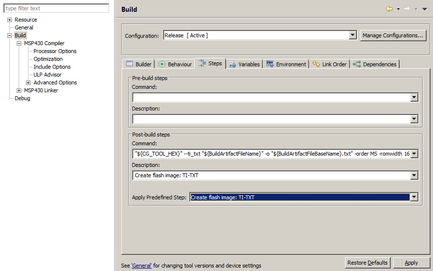 I'm trying to generate an HEX file in CCS. When I select the TI format, I see the selection displayed for 1 second then it fades away.