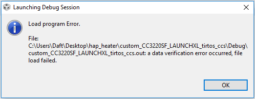 Cortex_M4_0: GEL: File: C:\Users\Daft\Desktop\hap_heater\custom_CC3220SF_LAUNCHXL_tirtos_ccs\Debug\custom_CC3220SF_LAUNCHXL_tirtos_ccs.out: a data verification error occurred, file load failed.