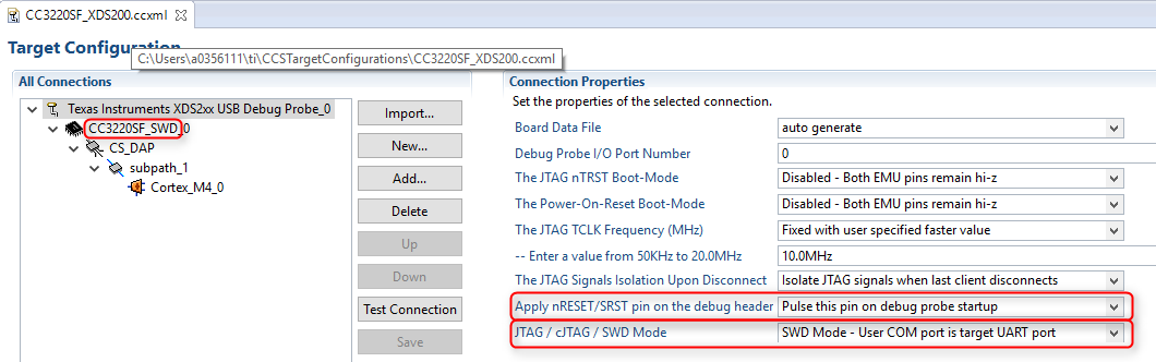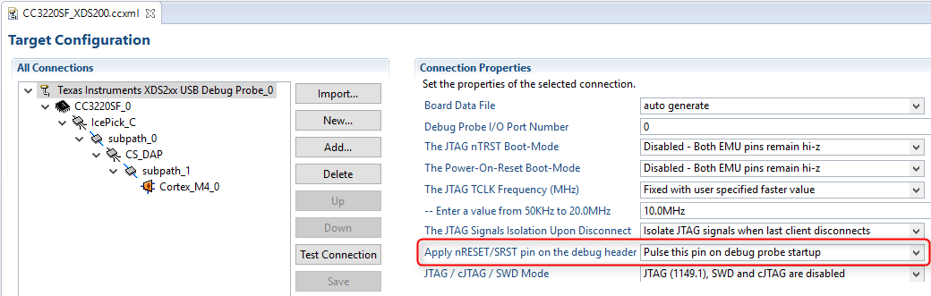 I am using CC3220 for my custom board.I am trying to program it by XDS200. All the connections I have cross checked,its fine.i followed the TI wiki for XDS200 also,When i am running the jtag test connection script I am getting the following error