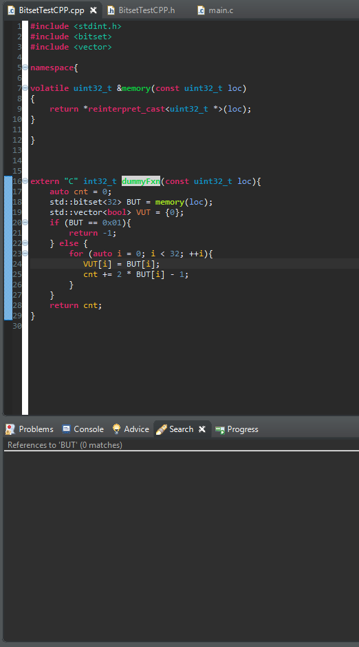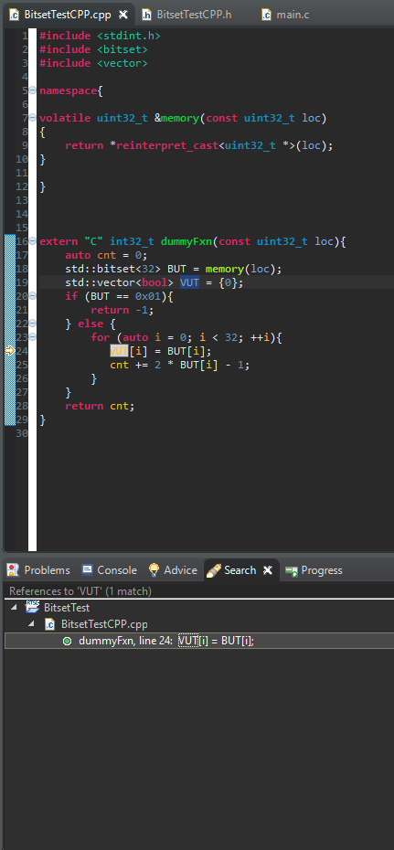Whenever I use std::bitset objects, the indexer fails to find or highlight references to bitset objects. In "dark" mode, they're colored white like they're globals, and suggestions turn off completely when I try to autocomplete their methods.