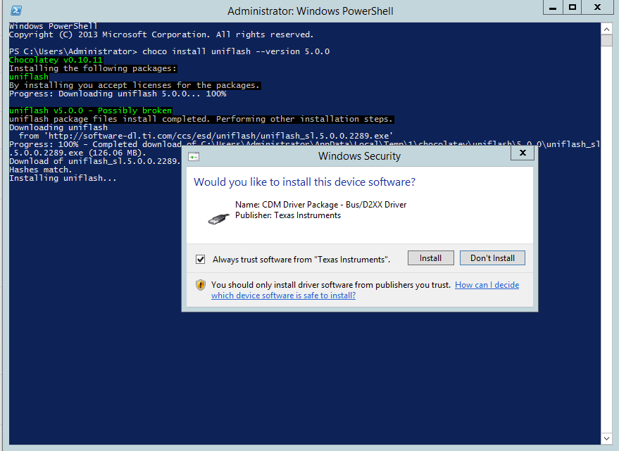 I've noticed that Uniflash installation is not really unattended because of the needed driver certificates that needs to be installed.