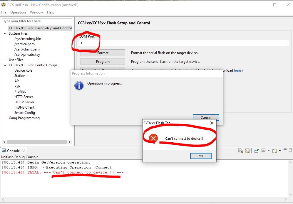 It very hard time to get uniflash visible on COM Port on windows 10 see below error receiving. I do have COM Port visible on device Manager but showing hardware device is not connected to the computer. (Code 45)