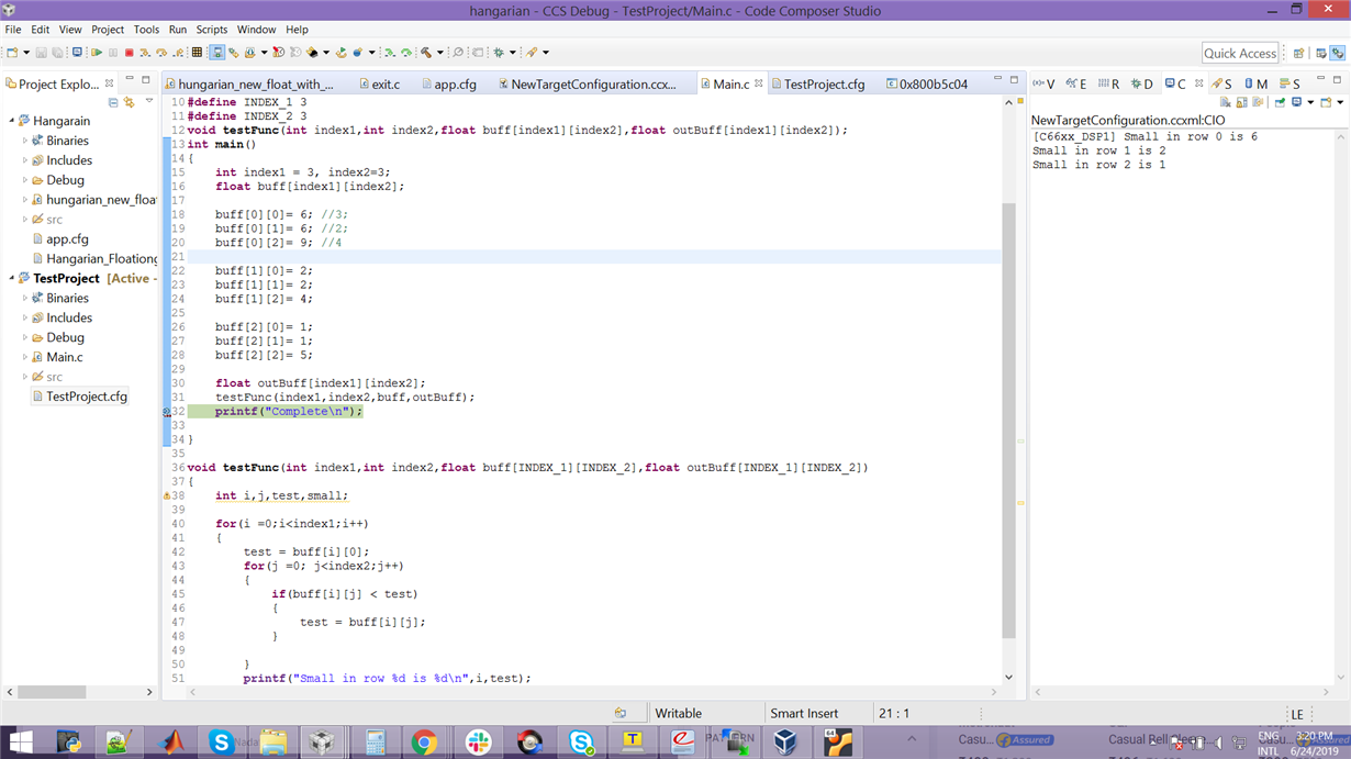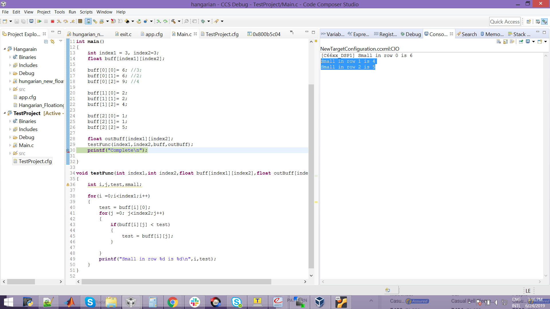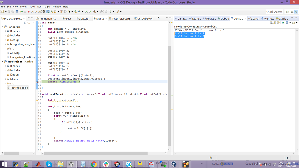 #include<stdio.h> void testFunc(int index1,int index2,float buff[index1][index2],float outBuff[index1][index2]); int main() { int index1 = 3, index2=3; float buff[index1][index2]; buff[0][0]= 6; //3; buff[0][1]= 6; //2; buff[0][2]= 9; //4 buff[1][0]= 2; buff[1][1]= 2; buff[1][2]= 4; buff[2][0]= 1; buff[2][1]= 1; buff[2][2]= 5; float outBuff[index1][index2]; testFunc(index1,index2,buff,outBuff); printf("Complete\n"); } void testFunc(int index1,int index2,float buff[index1][index2],float outBuff[index1][index2]) { int i,j,test,small; for(i =0;i<index1;i++) { test = buff[i][0]; for(j =0; j<index2;j++) { if(buff[i][j] < test) //error seen here { test = buff[i][j]; } } printf("Small in row %d is %d\n",i,test); } }