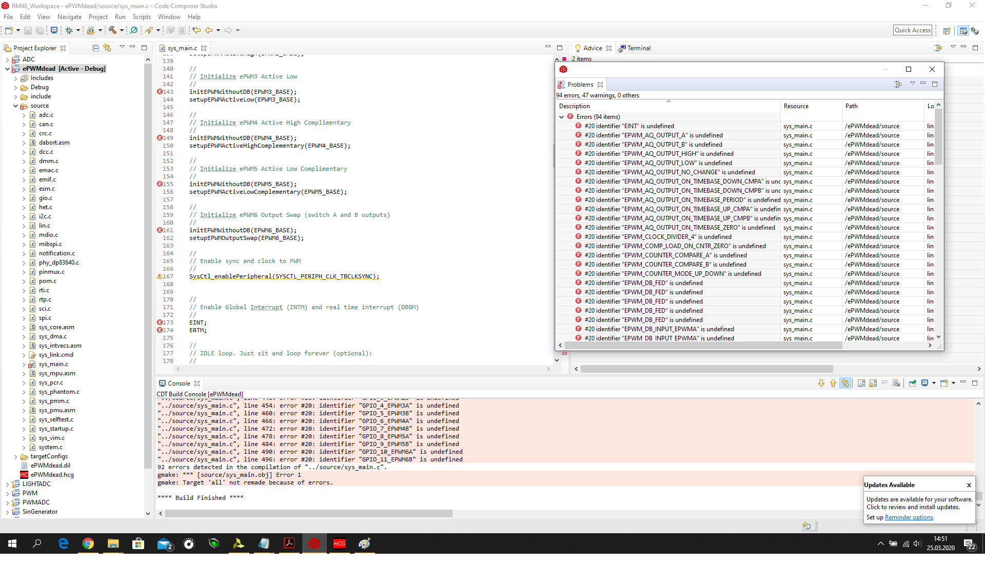 Hello, I try c2000 examples in code composer studio but I get 94 errors. I could make none of them work. What could I do possibly wrong? I changed nothing in the code. I tried with and without halcogen but anyway I get errors.