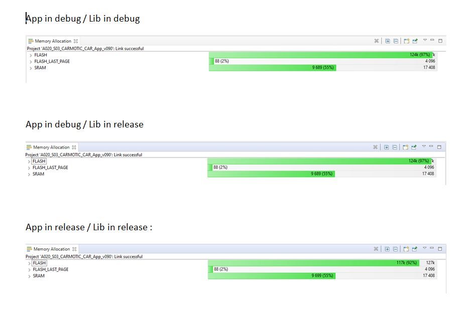 So, I did the same things on both application and library, build parameters settings. These consists to suppress debug informations, and set maximum code optimizations for size. I have set two build configurations :