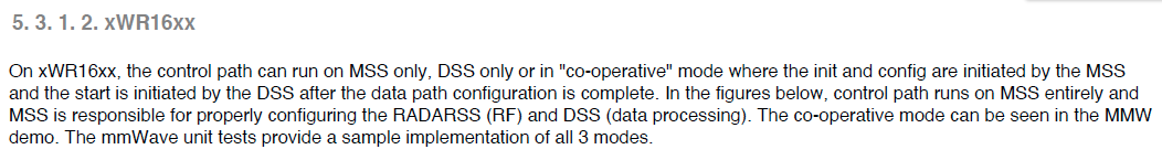 I notice in the SDK, TI documents that the control path can run on the MSS entirely on its own (without running the DSS in the "co-operative" mode) to configure the RADARSS (RF). The mmWave unit tests provide sample implementations.