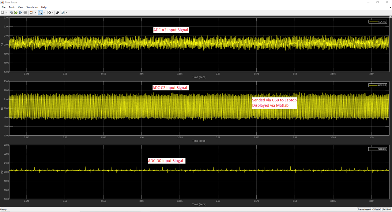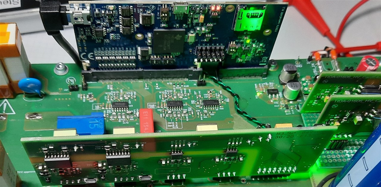 I am using an f28379d control card to control the TIDA-010039, three stage, three phase SiC AC / DC converter. I program the MCU via Matlab Simulink and it works fine for me but I am having trouble reading the ADC's input voltage via USB. When I display the measured voltages on the PC via a USB connection, I have a noisy signal with around 100 bits, which means around 80 mV noisy signal (3.3 V reference). If I measure the voltage directly at the input pin of the control card or alternatively behind the integrated noise filter, I cannot see any noise. It's close to a perfect signal.