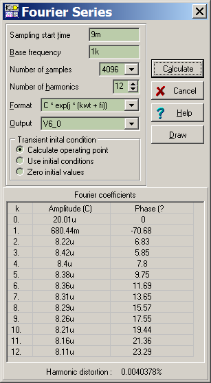I have Tina-Ti, with all types of analogs circuits simulations, wen I use the Fourier Series analysis it give wrong values since it give mostly between 7% and 50% of distortions reading, I did compared those distortions numbers of my circuits by making prototypes using my HP distortion analyser and the number are a allways under .01% of distortion with my HP.