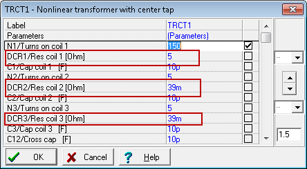 Please refer to my circuit below. we are curious that the balance problem between Vout+ and Vout-. When we changed the DCR2 and DCR3, the balance will change. I would like to know where the DCR2 and DCR3 in the model? just like the ideal inductor series a resistor? in the ideal transformer model, what is the DCR value? zero? I did not see the balance problem by using ideal transformer.