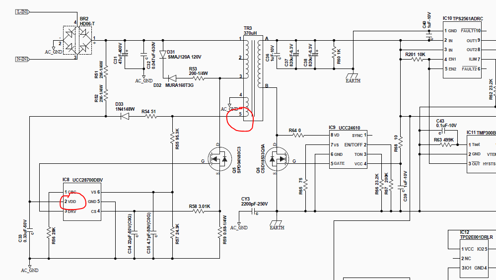 Customer of mine is designing USB type A charger that uses this reference circuit. Initial debugging, we found no output at Transformer pin 5, hence no output at pin Vdd of UCC28700. further measure found that D33 or R52 output voltage is just around 1V