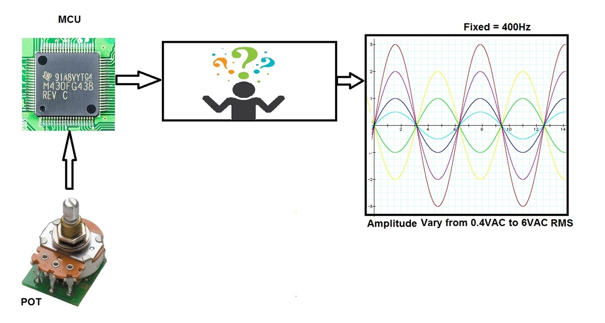 Using MSP430-MCU or Any other MCU , I needed to Generate Sine-wave having Fixed Frequency 400Hz & needed to vary Amplitude from 0.4VAC to 6VAC RMS using POT which is given to MCU.