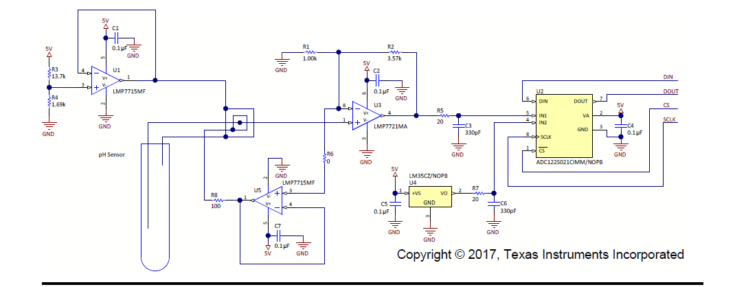 Within this, the guard ring shown in the left side seems very confusing. As per my observation, I see the outer ring connected to the output terminal of LMP7715 (U1) and one of the pH probe. Whereas, the inner ring is seen connected to U5. But there is no connection with the other probe of the pH sensor, which breaks the circuit (according to me).