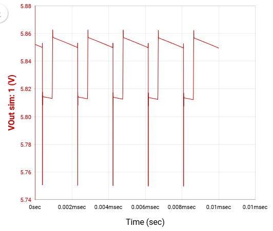 My shared design webench.ti.com/.../SDP.cgi uses the default components now chosen by WEBENCH for the specified input and output requirements. The tabulated results show an output ripple voltage of 11.06mV peak-to-peak. However, the steady-state simulation shows a much larger ripple: