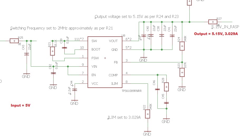 I want to determine the value of R28, C46, C45 and inductor to be used between VIN and SW pins. Can someone give me values to be substituted in equation 11 of datasheet or let me know how to proceed further. Also it would be kind if someone can cross check if my other values are correct or wrong.