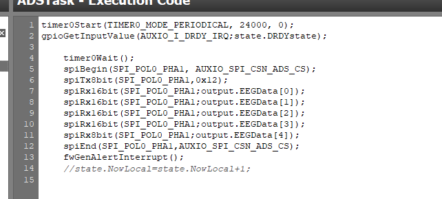 A. If initializing with the following code, using CCS debugging, it can be seen that an SPI request is initiated every 1ms. AUXIO_I_DRDY_IRQ is always high, so the dead loop always runs, fwGenAlertInterrupt wakes up and the main processor scTaskAlertCallback does not execute.