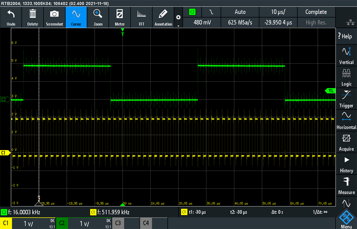However, when I connect my phone to the CC256 via Bluetooth and make a phone call to get HFP data going, the CC256 appears to be driving the AUD_FSYNC_1V8 and AUD_CLK_1V8 pins, as shown in the oscilloscope capture below. The green trace (top) is the LR clock (AUD_FSYNC_1V8) and yellow is the bit clock (AUD_CLK_1V8). These signals are disconnected from the STM32 and connected only to the CC256 and the scope probes. I would have expected the CC256 not to drive these clock signals and instead to accept them as inputs, given my configuration for the PCM clock direction above. What am I missing here? How can I configure the CC256 for I2S in slave mode?