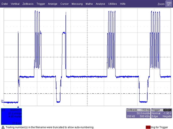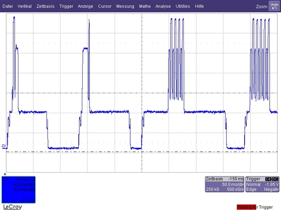 With BTool, I see that the data arrives, but unfortunately I can’t use a sniffer to check if 4 packets per interval are sent. For this reason I take an oscilloscope to check the Rx/Tx phases.