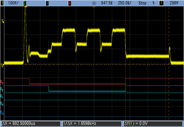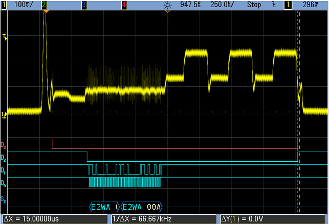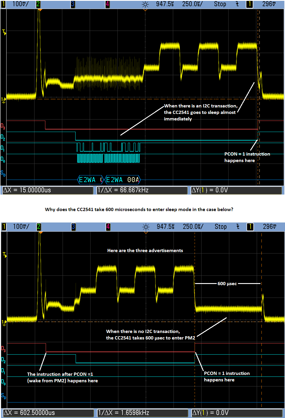 When there is no I2C traffic, it takes 600 µsec to sleep after SLEEPCMD = 6 and PCON = 1. In the picture below, D2 and D3 are IOs that I'm toggling in code right before PCON = 1. The next 600 µsec is after the PCON = 1 statement and before the following statement (we use a NOP), the one executed after waking from PM2. D3 goes low just before the NOP.