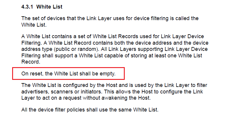 I'm using the PAN1323 module with the Bluetopia stack. My question is whether or not the white list is preserved by the CC256x device. Or, does the white list need to be re-established after every power cycle?