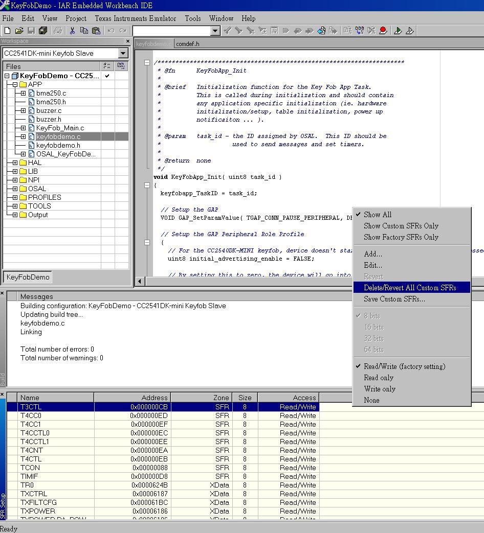 Mon Feb 23, 2015 16:10:45: The custom SFR file 'C:\Texas Instruments\BLE-CC254x-1.4.0\Projects\ble\SensorTag Status\CC2541DB\SensorTagCustomSfr.sfr' contains a modification of the factory