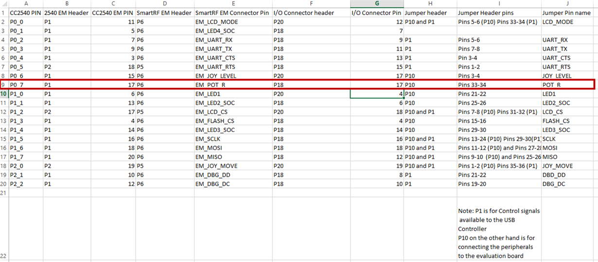 Anyways, moving forward, if I had to explain the following mapping table, I would say pin P0_7 on the CC2540 maps to Pin 17 on the CC2540EM which maps to the P6 connector on SmartRF which connects to P18 header on Pin 17. To make this pin accessible from the EM board and use it as a GPIO, I would have to take out the jumper on Pins 33-34 on pin header P10.