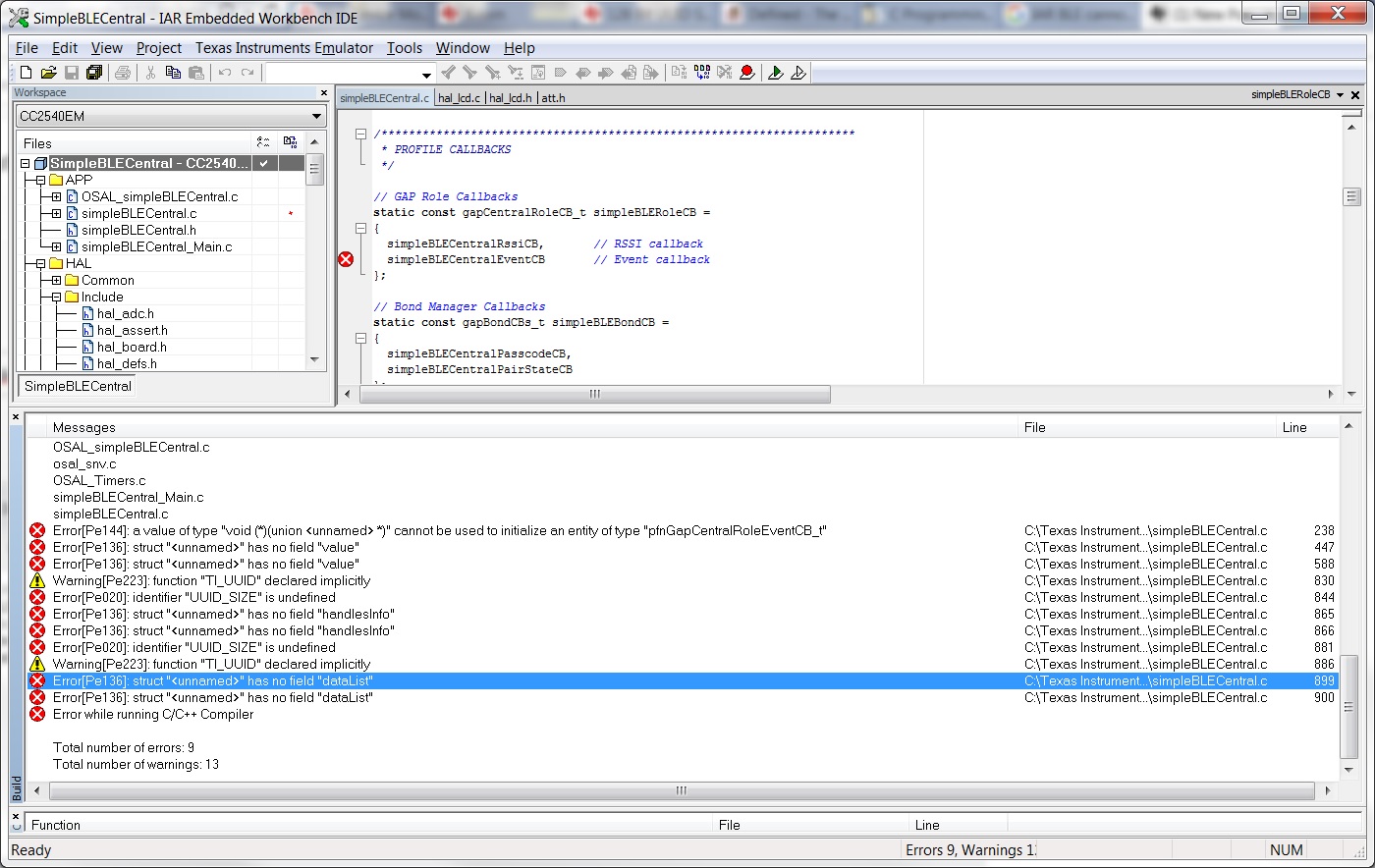 I have a CC2540 EM dongle. I made a copy of the SimpleBLECentral folder which resides in C:\Texas Instruments\BLE-CC254x-1.4.1.43908a\Projects\ble\. I have travelled the forumsphere and learned that I have to add USE_128_BIT_UUID to the define symbol inside the IAR embedded workspace. Also I unchecked the overwrite default for Linker and Debugger and saved. I copied the simpleBLECentral.c which I got from the TI wiki (do search for 128-Bit UUID) and am using that c file in my project which was copied from forementioned activity. I rebuilt the code and observed all warnings were HAL_LCD.c related. I got 9 errors all related to the SimpleBLECentral.c file that is the new file.