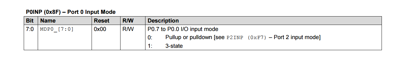 i am making cc2540 based device, in that i don't know how to make port pin to high impedance. i know only using PxINP i can set pin to high impedance but anywhere i can't found how to configure pin to make high impedance.