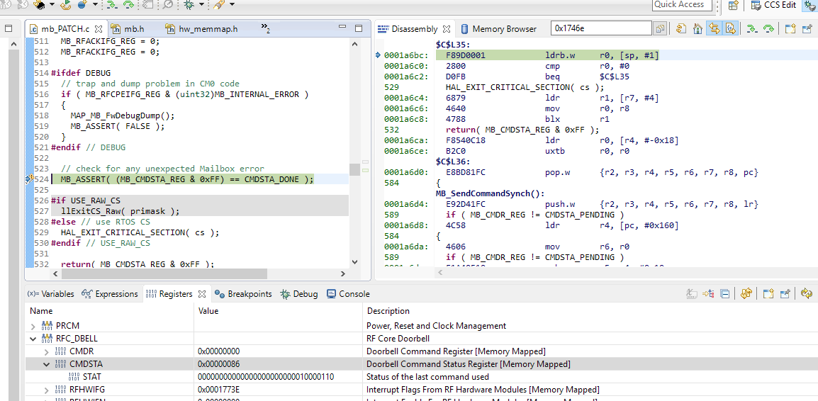 when trying to implement multirole feature in my CC2640 project (adding observer to a peripheral device) I see a crash of the application approx once in 48h. Crash means no more advertising, application stops. When debugging into a crashed device, I see an assertion fail in line 524 of mb_Patch.c
