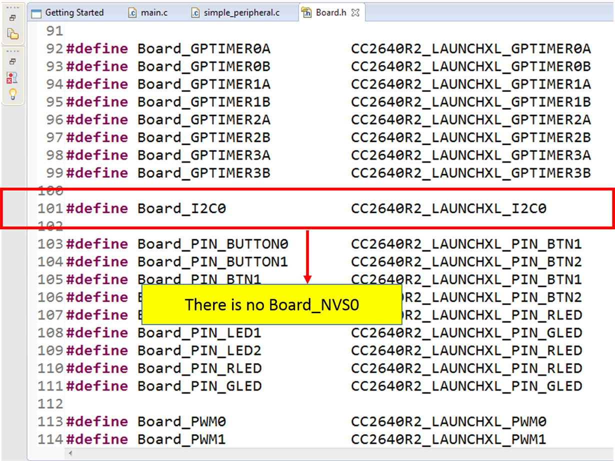 When I add "NVS_open(Board_NVS0, &nvsParams)" into main.c , however , there is no BOADR_NVS0 in Board.h, as shown in picture 1. The correct Board.h in nvs project is shown in picture 2 .As a result ,"rebuild simple_peripheral project failed" , as shown in picture 3.