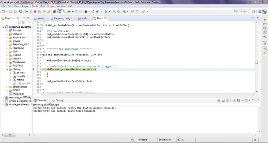 I am using the CC2650stk SensorTag2 with Code composer studio. While debugging the Sesnortag_app project it is getting stuck at exception handler on hwi_exchandler every time. I am followed the