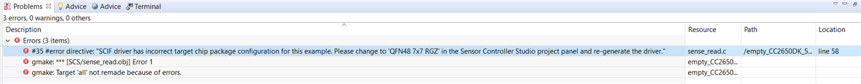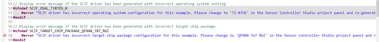 #35 #error directive: "SCIF driver has incorrect target chip package configuration for this example. Please change to 'QFN48 7x7 RGZ' in the Sensor Controller Studio project panel and re-generate the driver."