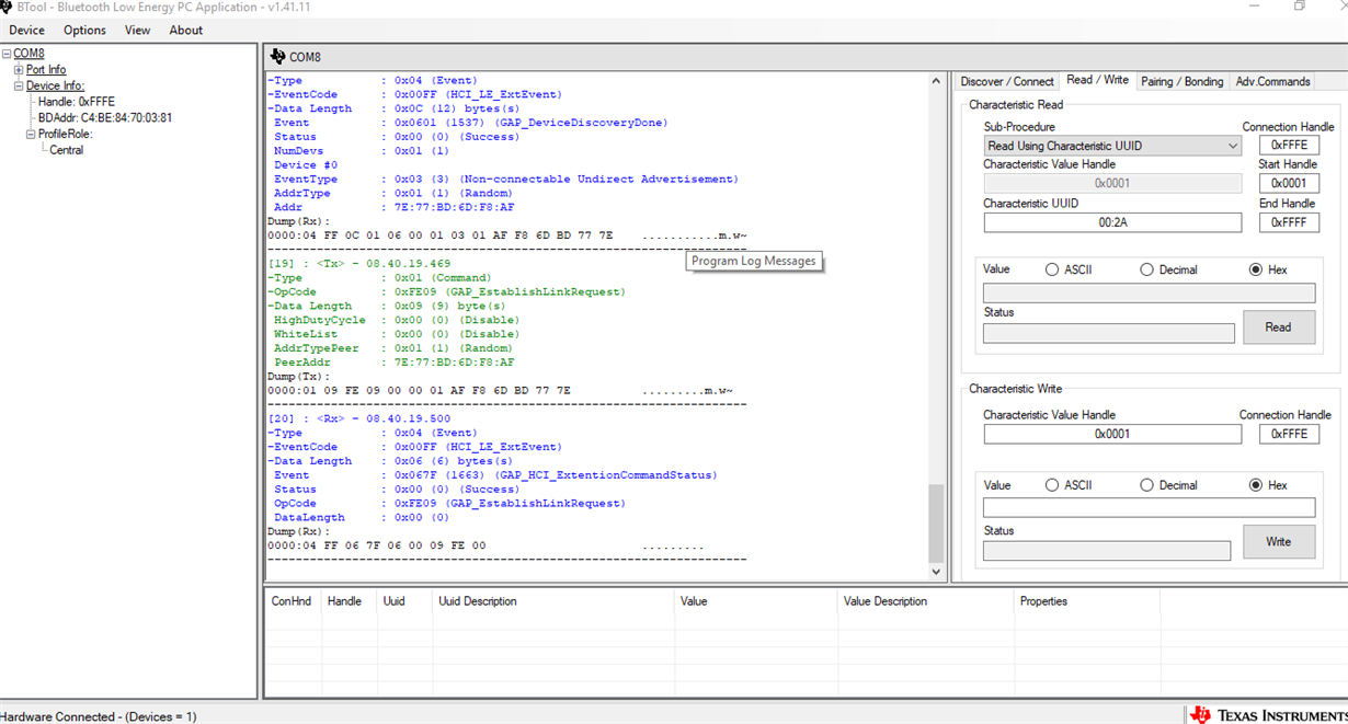 Hi guys, could you tell me how to detect the actual data from the sensortag through the Btool app? I'm following the guide (btool_user_guide TI), in the section "Reading a Characteristic Value by UUID" but I can not understand which values insert in the "characteristic UUID" in the "characteristic read" section in "read / write" ... for example to detect the data of the magnetometer I know that UUID number it's AA81, but why do you give me an error? how should I put it in the Characteristic UUID?