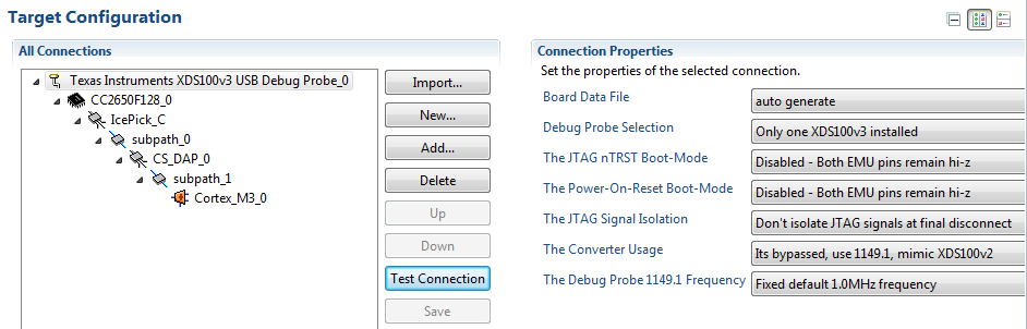 I am having issues performing test connection on TI's CC2640F128RGZ device with standard JTAG protocol (1149.1) using XDS100V3. I am using JTAG 14-pin connector according to the below table: