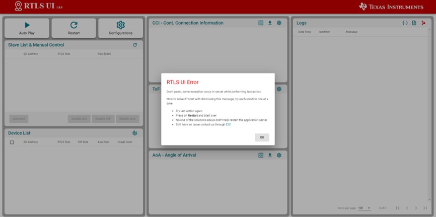 Occasionally, I can connect the devices, but the RTLS_UI cannot initialize. I use CCS 9.2, and Ihave changed the XDS version to 3.0.0.5 for both devices.