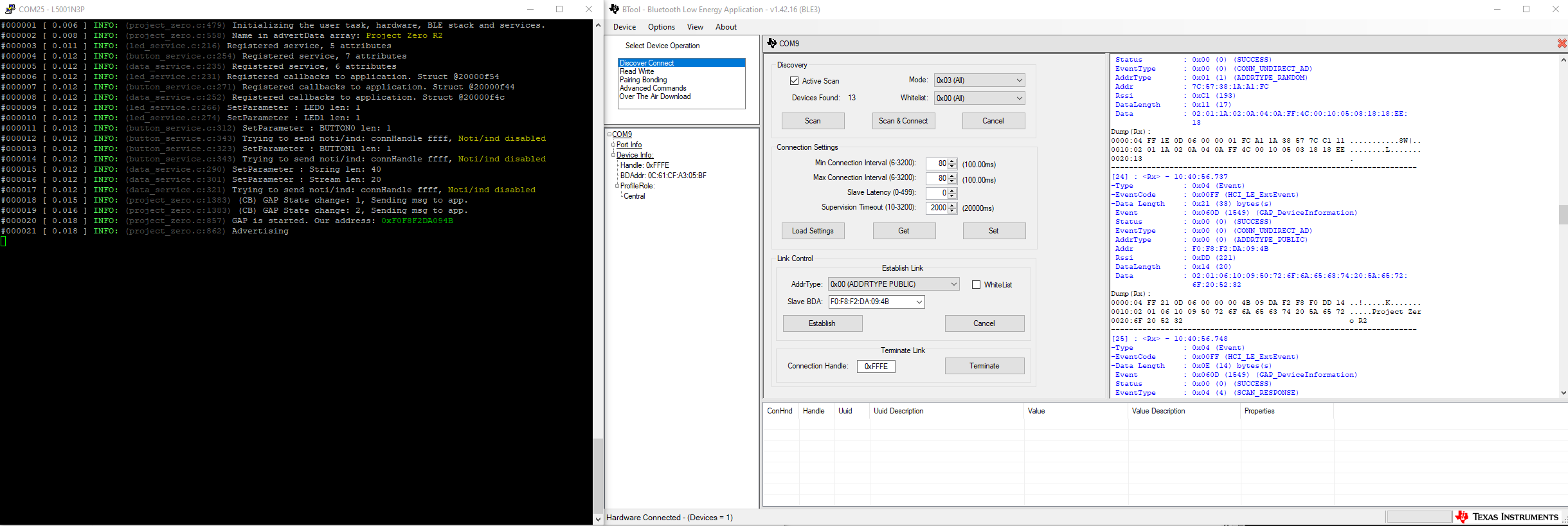 Thank you for the video. I was able to run a few more test, but was still able to see Project Zero advertising. I took a sniffer log and attached it to this post. (Wireshark). The Project Zero peripheral has an address of TexasIns_da:09:4b. This test lasted a minute and Project Zero was seen advertising throughout. Are you able to take a sniff log or use another phone to see if you are able to see the advertisements for longer? This may be a phone specific issue. What is the specific iPhone model you are using?