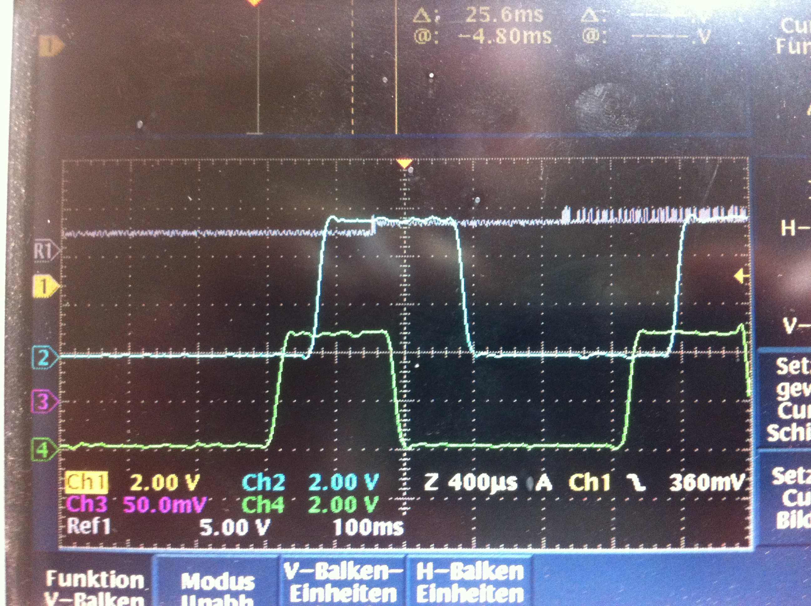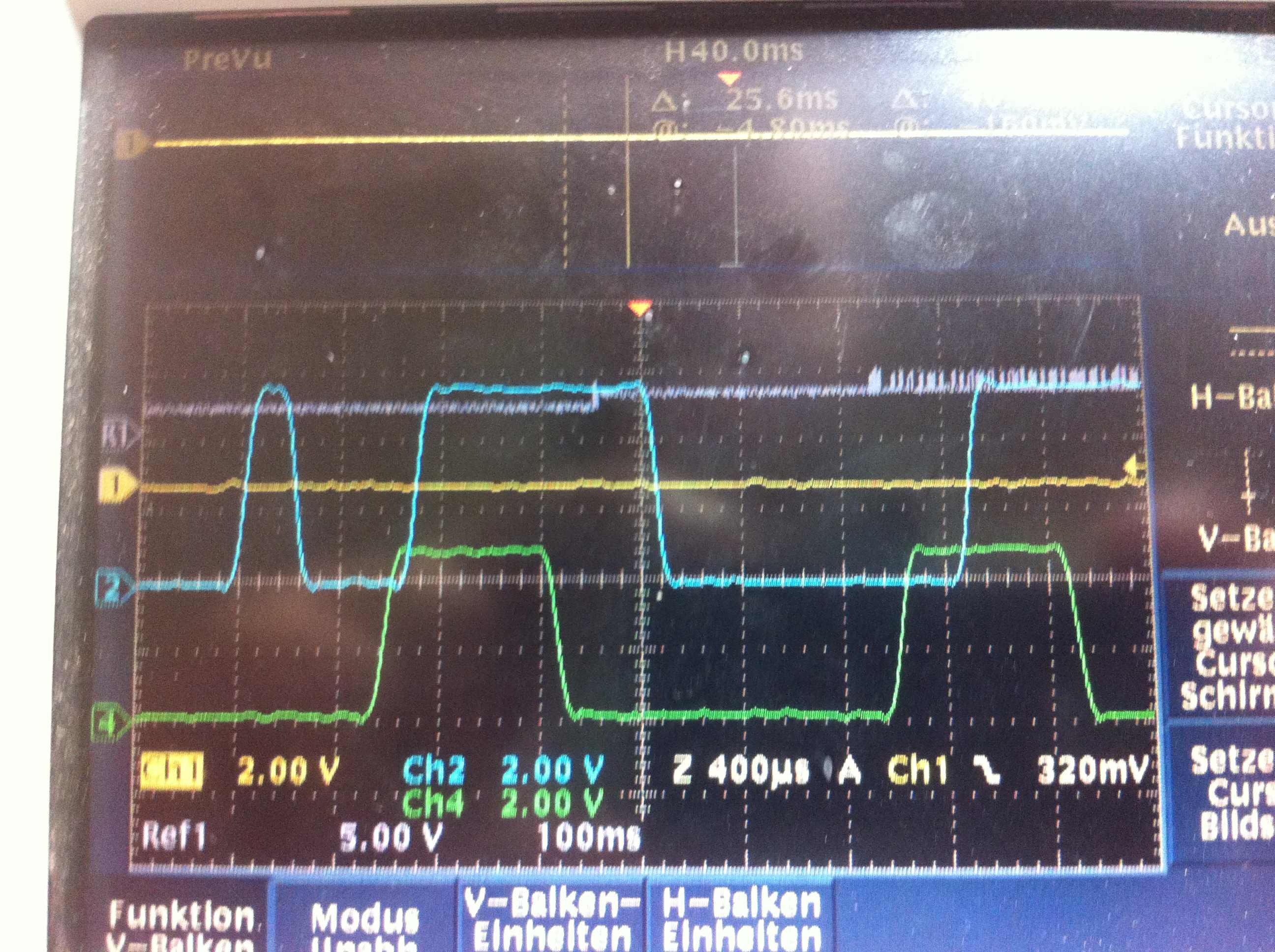 Pictures both shows start of paket transmission (48bit pakets with 12ms pause (at 1kBit), 22ms pause (at 0.5kB)),