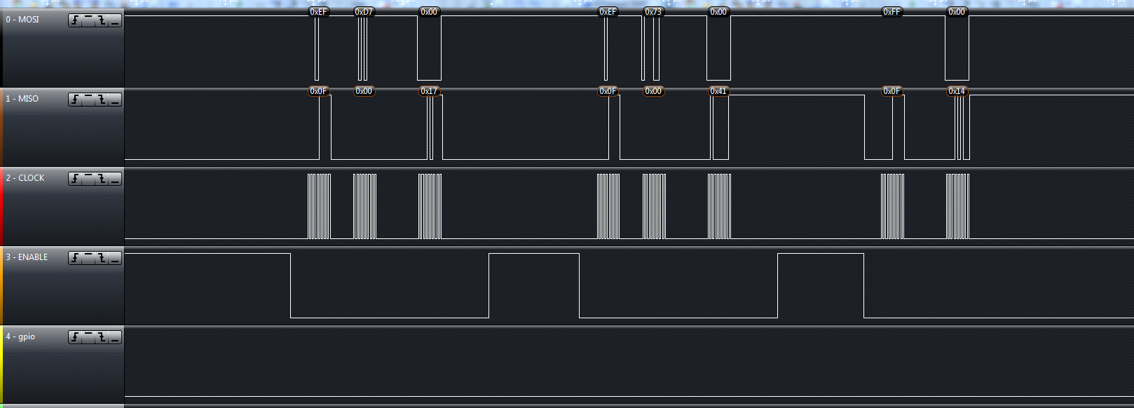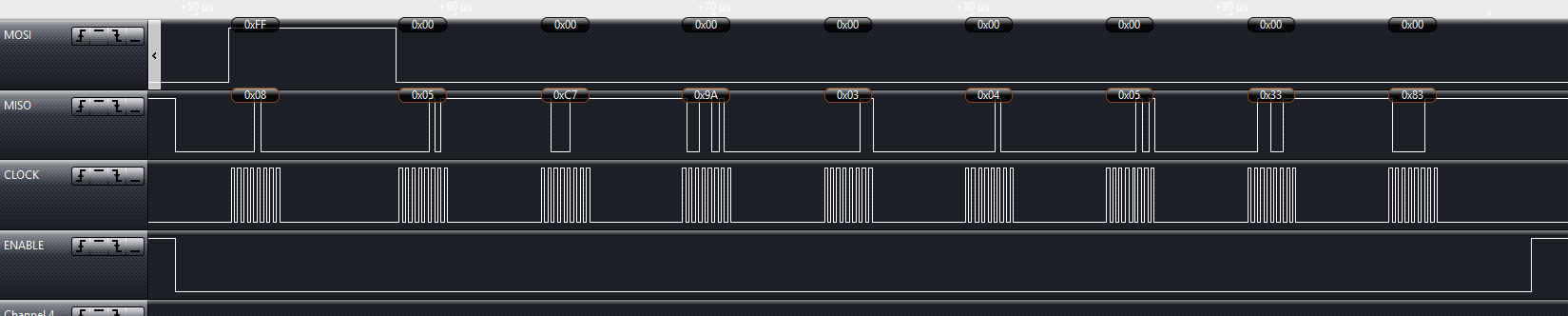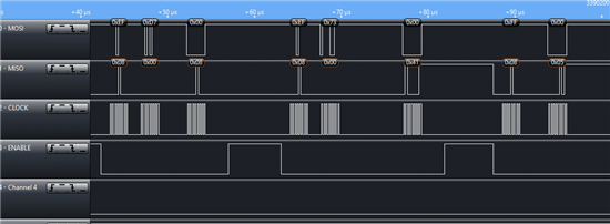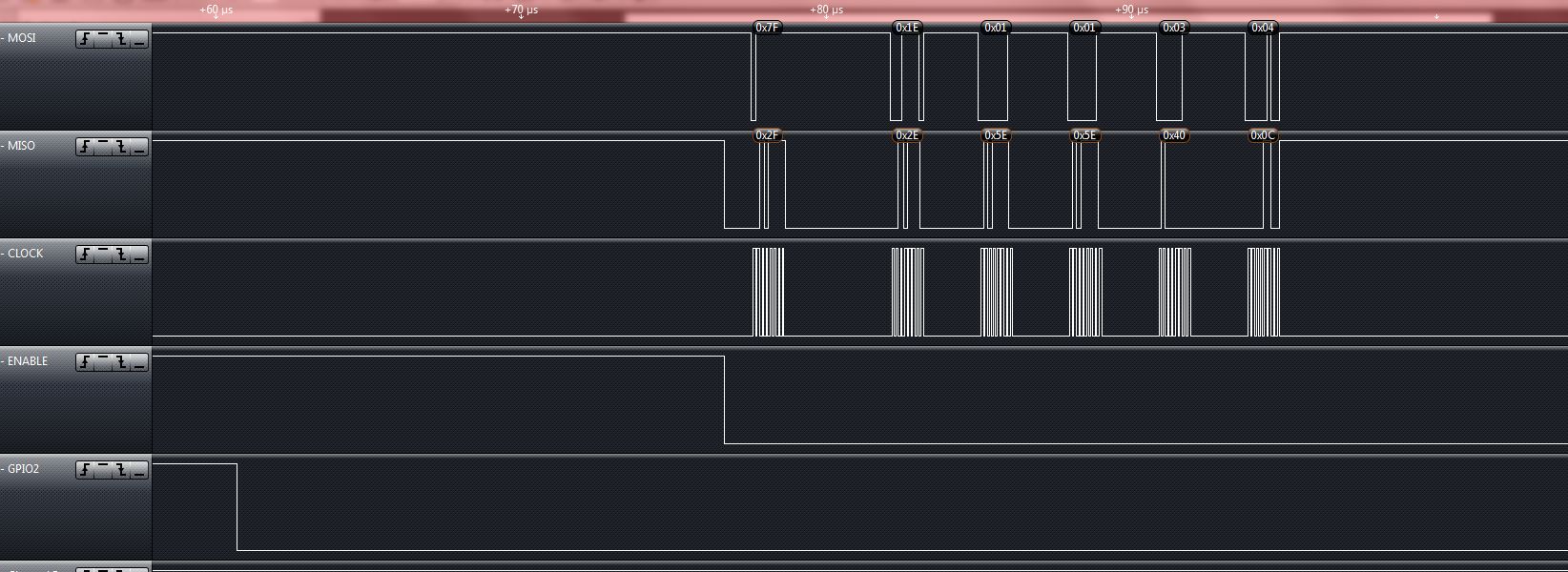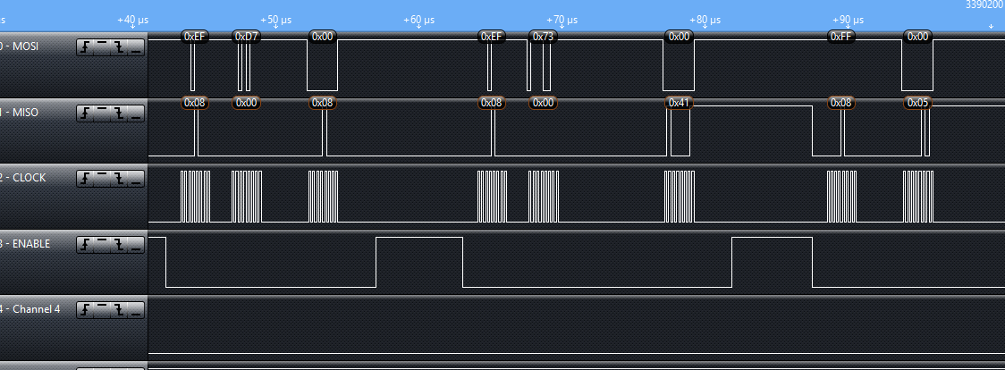 I'm trying to connect my own MCU to the CC1125 via its evaluation board. I believe that I have everything wired together properly. What I need help with is some of the SPI stuff. I ran the cc112x_easy_link software with the evaluation boards MPS430 mcu and I used a logic analyzer on the SPI bus, then I wrote the software for my MCU and ran it on the SPI bus and compared the two. My timing diagram is nearly identical, however I'm getting different status values back from the CC1125. I'm seeing that the mps430 gets back a status byte of 0x7F for each write command. Mine however is getting decremented values that stay between 0x7F and 0x70, cycling over and over again. (I've attached images for reference).