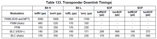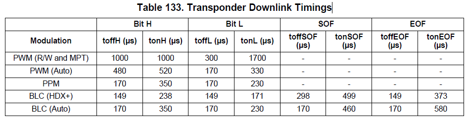 "Table 133. Transponder Downlink Timings" in the reference guide