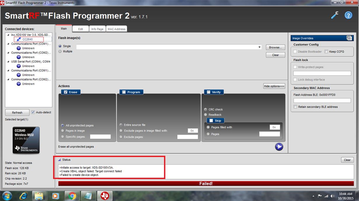 2. On trying to erase code through Flash programmer, the process failed, "Failed to create device object" error was observed.