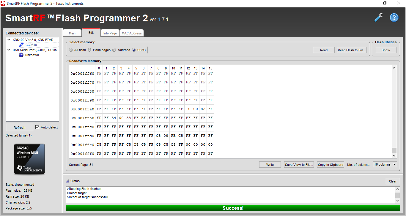 When using FP2 to flash my app.out file in my CC2640 what is happening is that CCFG area is always reset to default values. No matter if I use the check option "Keep CCFG" the result is always the same. Moreover, I see the following message in the logs: "Overlapping flash area in page: 31, offset address 0x0fac" corresponding to the CCFG memory zone. Is that normal? Is there any way to keep CCFG using a .out and FP2? In any case, what I don't understand is that CCFG values are not the ones selected by app, but the default ones (I have used .out file generated in CCS using the "Keep CCFG" option in debug settings and also without using this option, but the results are always the same).