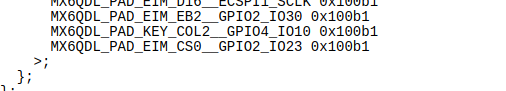 ecspi1 { pinctrl_ecspi1: ecspi1 { fsl,pins = < MX6QDL_PAD_EIM_D17__ECSPI1_MISO 0x100b1 MX6QDL_PAD_EIM_D18__ECSPI1_MOSI 0x100b1 MX6QDL_PAD_EIM_D16__ECSPI1_SCLK 0x100b1 MX6QDL_PAD_EIM_EB2__GPIO2_IO30 0x100b1 MX6QDL_PAD_KEY_COL2__GPIO4_IO10 0x100b1 MX6QDL_PAD_EIM_CS0__GPIO2_IO23 0x100b1 >; }; };