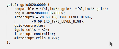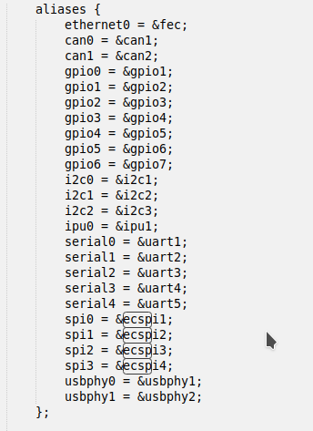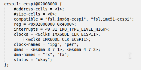 ecspi1 { fsl,spi-num-chipselects = <1>; cs-gpios = <&gpio2 30 GPIO_ACTIVE_HIGH>; pinctrl-names = "default"; pinctrl-0 = <&pinctrl_ecspi1>; status = "okay"; spidev0: spi@0 { #address-cells = <1>; #size-cells = <1>; compatible = "spidev"; reg = <0>; spi-max-frequency = <2000000>; status = "okay"; }; };