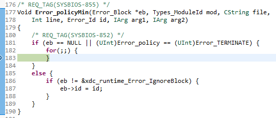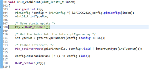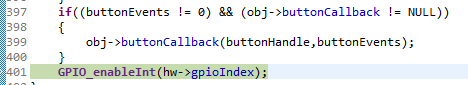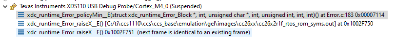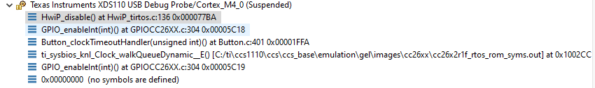 After executing the button callback (including LED toggling, radio power down and sleep), the code runs into the GPIO_enableInt function but seems to fail when disabling the HWI (on HwiP_disable()). It then runs into the infinte loop of Error_policyMin().