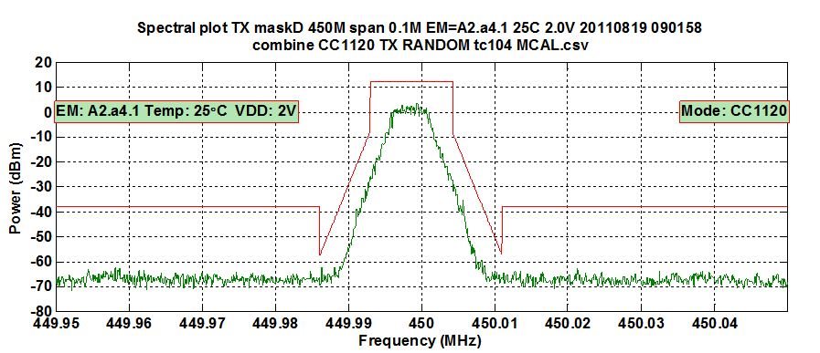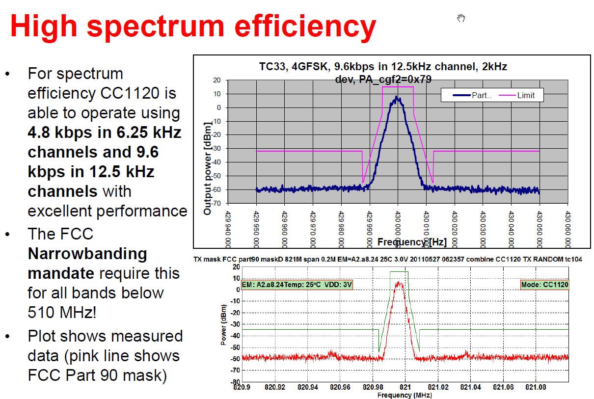 HI, I am looking at using CC1125 or CC1175 in design for radio to meet ETSI 300-113. I am concerned with adjacent channel power (> = -60dBc) and have recently found a TI presentation on LPRF (from 2011) showing spectral plot for CC1120 in narrow band (12.5KHz channel) transmit at 9K6bps 4GFSK.