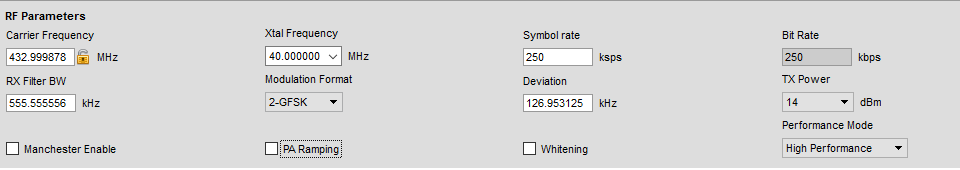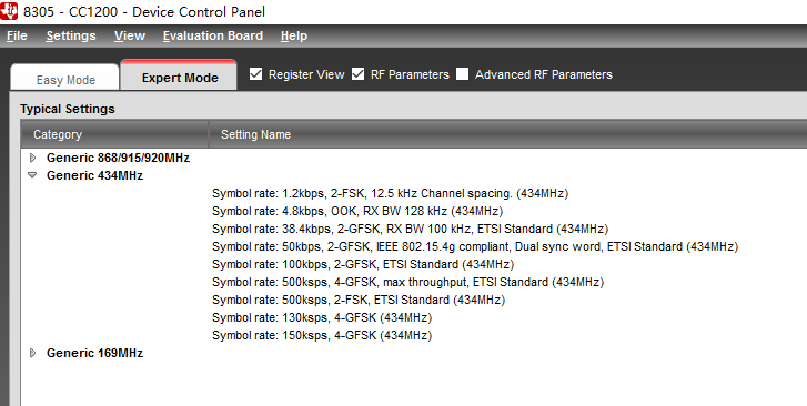 When I use SmartRfStudio V2.5.1 to export the register settings for CC1200, I found it doesn’t have a default setting for 433M and 250k bps 2-GFSK. The following is the list of default settings: