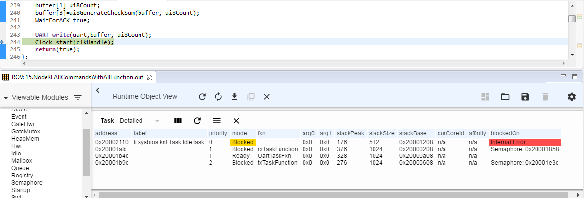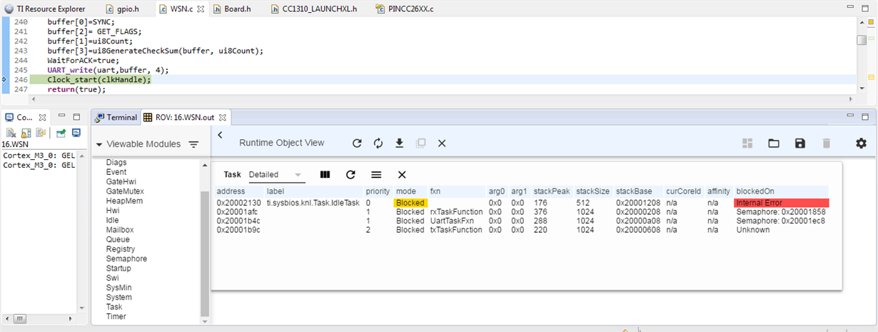 When GPIO interrupt occurs then GetFlags() function is called and when it executes the UART_write(uart,buffer, ui8Count); Then in the ROV ideal task shown to be blocked because of internal error and the whole program stops functioning. Please help me to solve the issue.