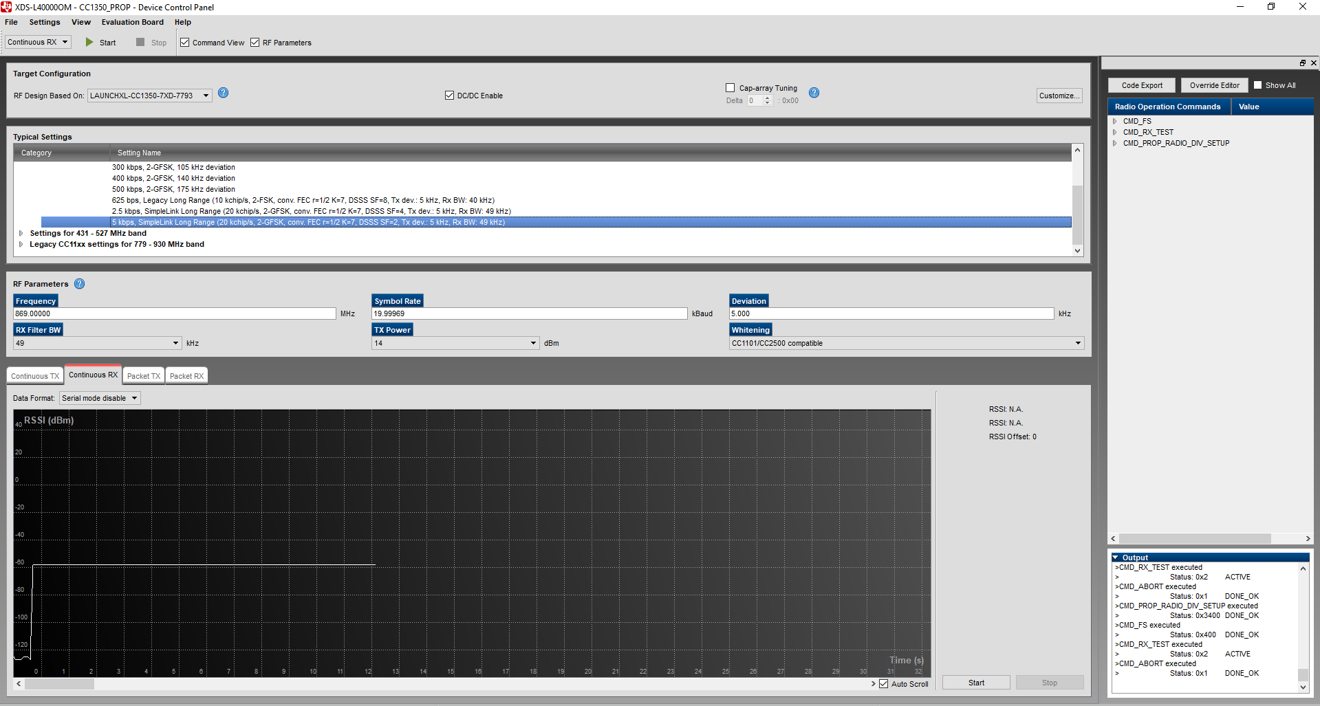 1- On lauchpad, start smartrfstudio and setup for Continoues RX